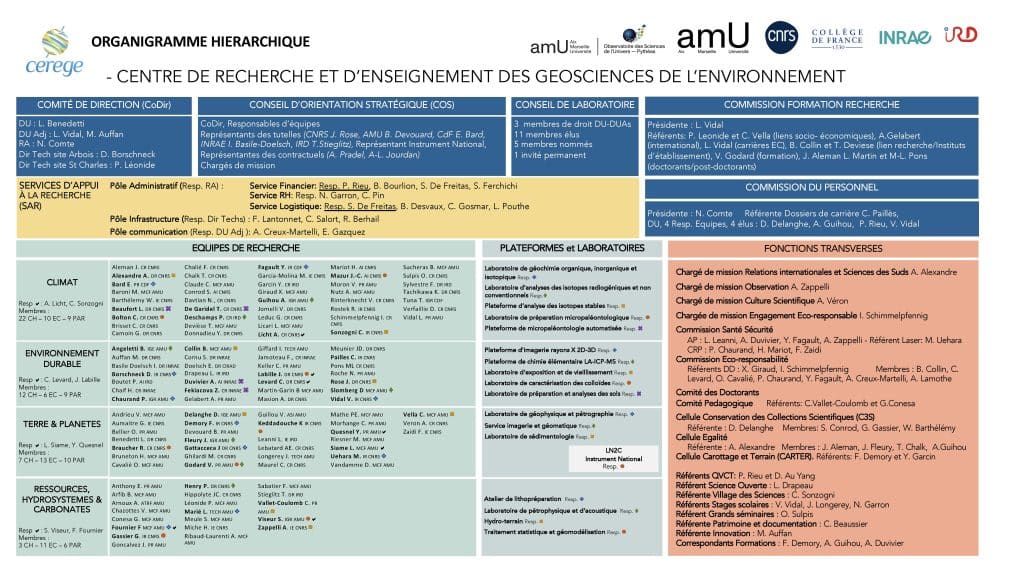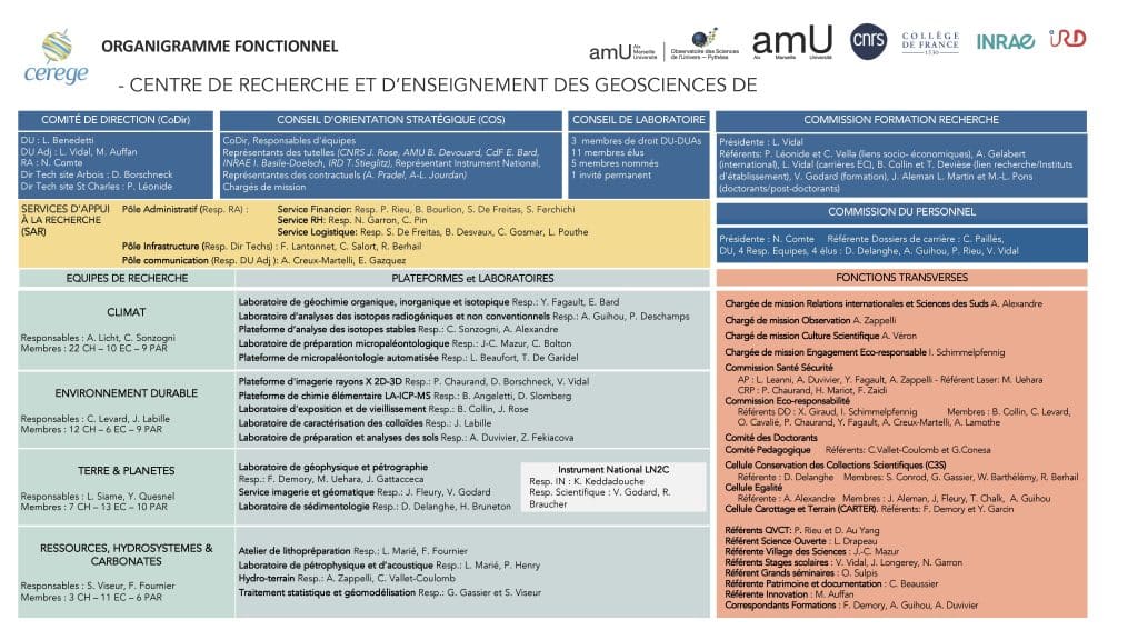 Le CEREGE présente quatre Équipes-Thématiques (Climat, Environnement Durable, Terre et Planètes, Ressources Hydrosystèmes et Carbonates) et un Service d’Appui à la Recherche (SAR).